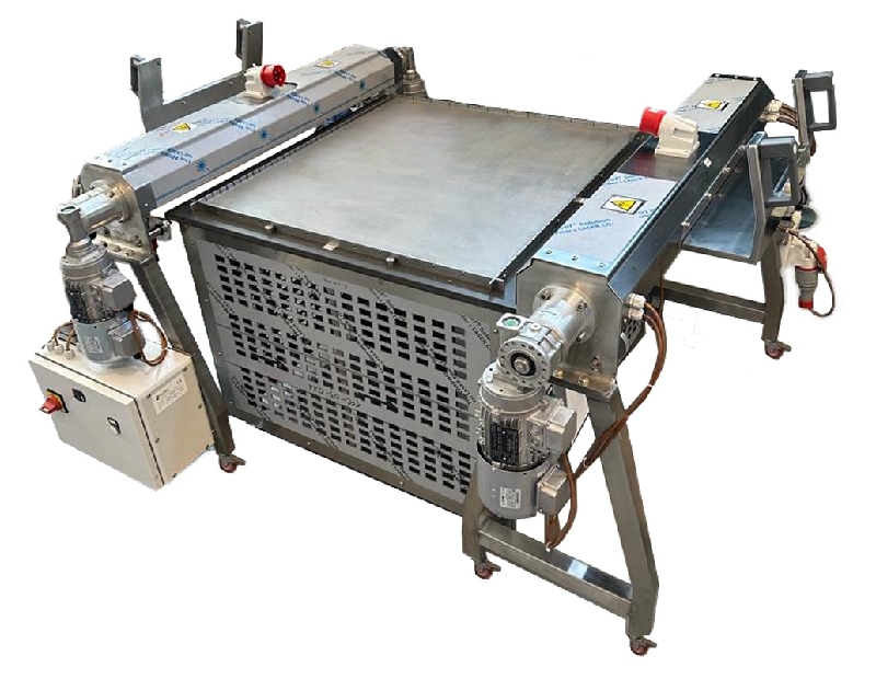 The table can be equipped / completed with two cutting groups with circular blades whose task is to cut the product “sticks” of the desired size, longitudinally and transversely.