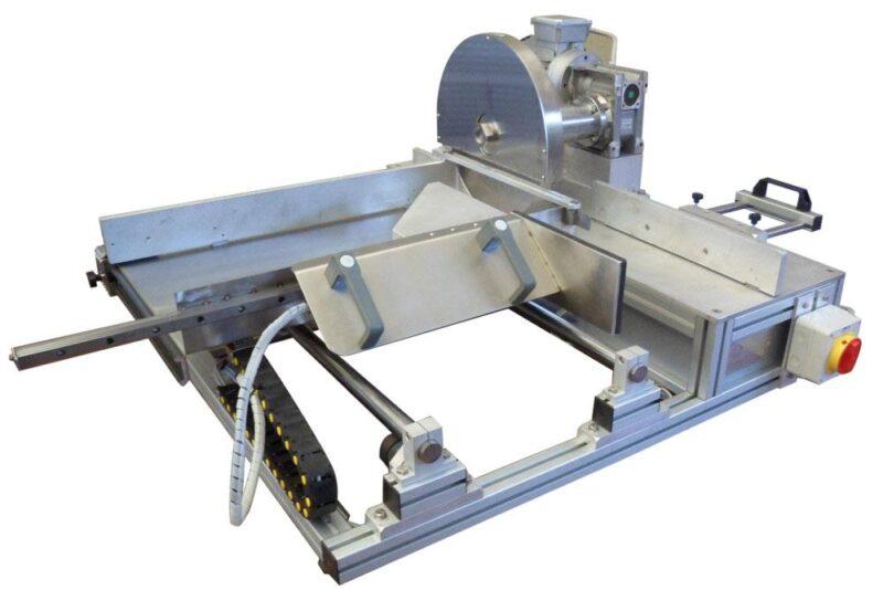 Semi-automatic cutter for cutting nougat, stainless steel structure. Manual setting of cutting width and length, manual feeding and cutting of the product.